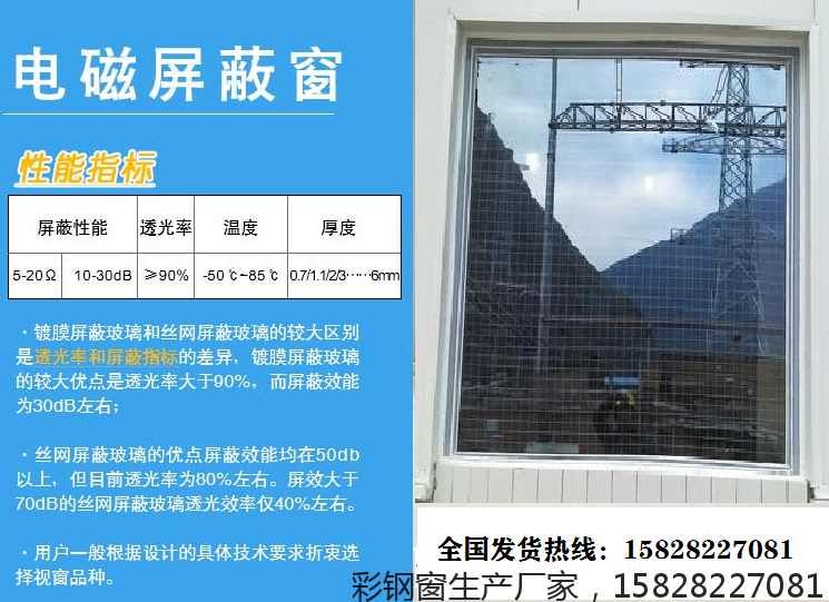 二、断桥铝合金屏蔽窗采用断桥隔热铝型材、中空镀膜玻璃及棱形屏蔽网组成,仿欧式结构,外形美观,具有节能、隔音、防噪、防尘、防水功能。这类门窗的热传导系数K值为3W/m2?K以下,比普通门窗热量散失减少一半,降低取暖费用40%左右,隔声屏蔽量达40dB以上,水密性、气密性良好,均达国家A1类窗标准。