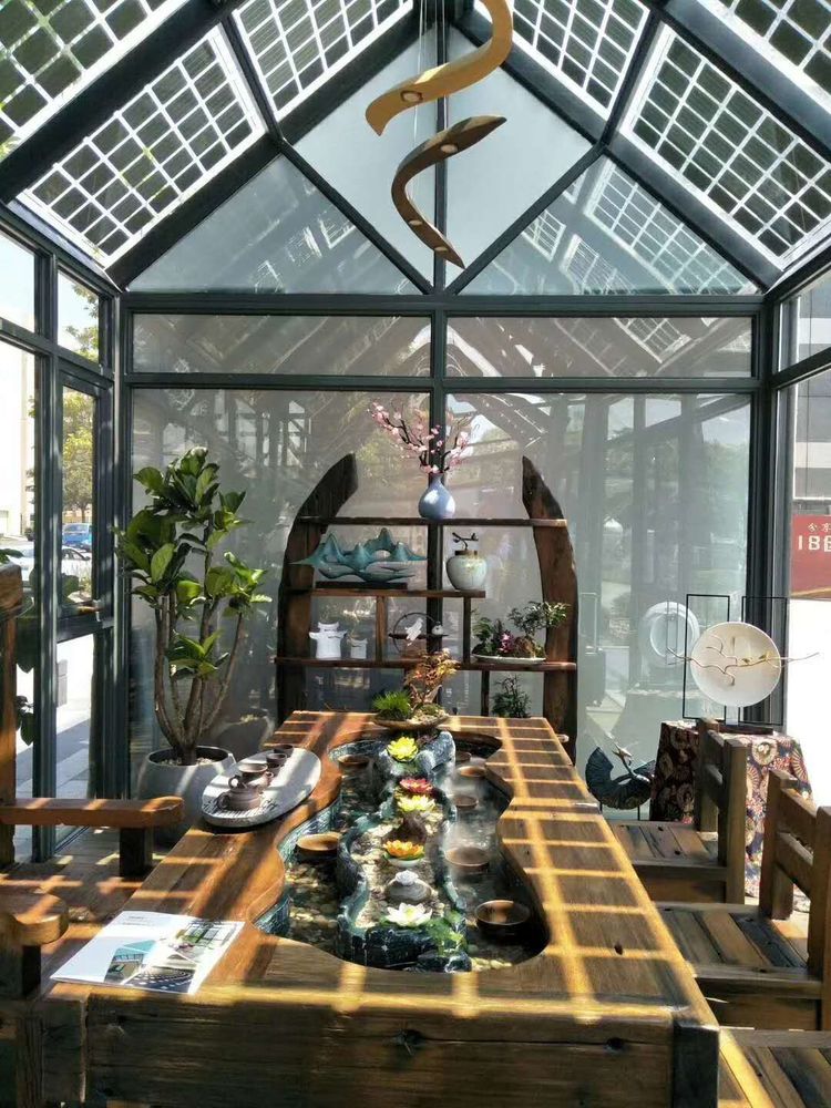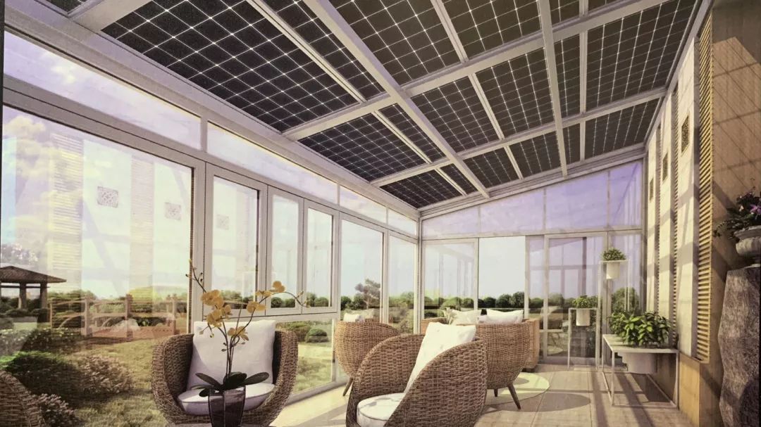 太阳能光伏阳光房采用光伏组件+玻璃,既能满足透光需求,又能合理遮挡光线,防止室内温度过高。所发电量自发自用,余电上网,无蓄电池:太阳能板所发的直流电通过逆变器转换成交流电,并入电网或者供局部电网(家庭、单位、办公室)用电。