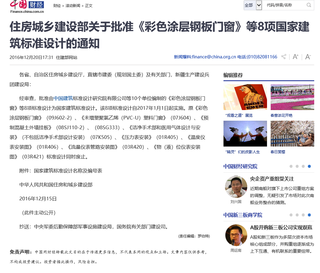 经审查,批准由中国建筑标准设计研究院有限公司等10个单位编制的《彩色涂层钢板门窗》等8项标准设计为国家建筑标准设计。该8项标准设计自2017年1月1日起实施。原《彩色涂层钢板门窗》(09J602-2)、《未增塑聚氯乙烯(PVC-U)塑料门窗》(07J604)、《预制混凝土外墙挂板》(08SJ110-2)、(08SG333)、《洁净手术部和医用气体设计与安装》(不包括洁净手术部设计安装)(07K505)、《压力表安装》(01R405)、《温度仪表安装图》(01R406)、《流量仪表管路安装图》(03R420)、《物(液)位仪表安装图》(03R421)标准设计同时废止。